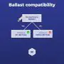 A ballast can be seen as an energy regulator that switches on the lighting. Is there a starter in the fixture? Then this is a conventional ballast (EM). Fixtures with an electronic ballast (HF) don't have a starter. A LED driver can be compared to an electronic ballast and only works with LED lighting.